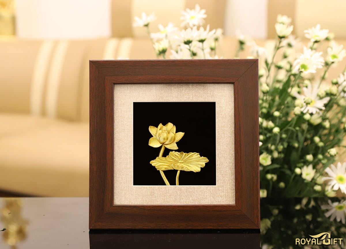Tranh hoa sen Việt Nam mạ vàng được chế tác hoàn toàn thủ công, mang vẻ đẹp thanh khiết quý phái. Đây là mẫu quà tặng độc đáo sang trọng để tặng đối tác kinh doanh, sếp nữ, hay quan khách nước ngoài khi đến thăm Việt Nam.